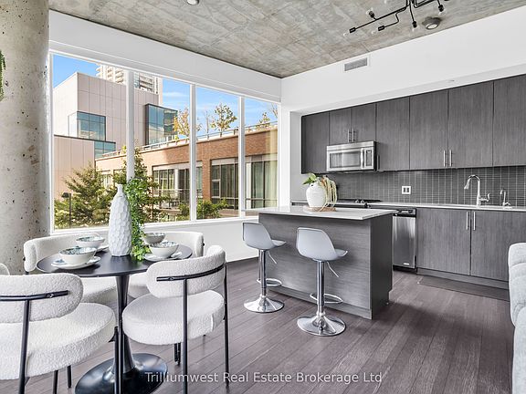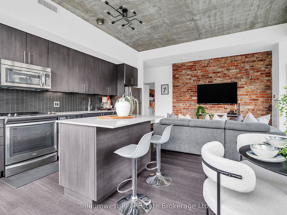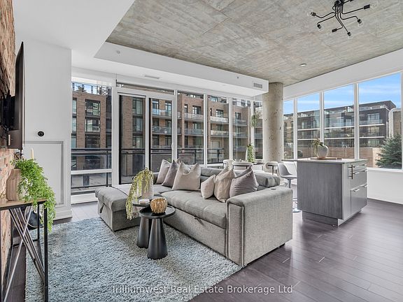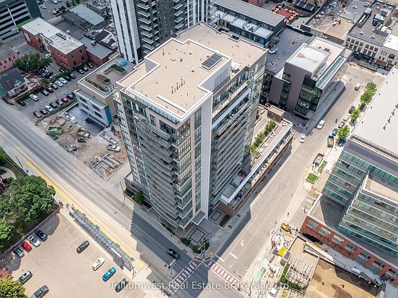 Step into contemporary luxury with this bright and stylish 1-bedroom corner unit, distinguished by premium loft-style upgrades, soaring 10-foot concrete ceilings, and floor-to-ceiling windows spanning across two walls that flood the space with natural light. Enjoy the added convenience of underground parking and a private storage locker, both owned. The building welcomes you in with a sleek, modern lobby and 24/7 concierge service, setting the tone for a high-end living experience. This rare unit offers one of a kind upgrades throughout from handsome dark flooring and industrial-inspired lighting to a striking exposed brick feature wall that adds texture and character to the bright, open-concept layout. The spacious balcony runs the full width of the unit, offering an ideal space to relax or entertain. The well-appointed kitchen features quartz counters, modern backsplash, an island with breakfast bar, and space for intimate evenings dining in. The bright and airy bedroom includes floor-to-ceiling windows and a generous double closet. Additional features include a welcoming foyer with a double closet and in-suite laundry for ultimate convenience. Perfectly located in the heart of Downtown Kitchener, just steps from the LRT, this unit offers unparalleled access to tech hubs including Google HQ, and leading educational institutions like University of Waterloo, Wilfrid Laurier, and Conestoga College. Explore vibrant city living with Victoria Park, restaurants, cafes, shops, and entertainment all just steps away. When youre not enjoying the surrounding neighborhood, take advantage of the buildings amenities: rooftop patio, fitness centre, party room, and dog wash station. Dont miss your chance to live or invest in one of Kitcheners most sought-after locations. Book your private showing today!
