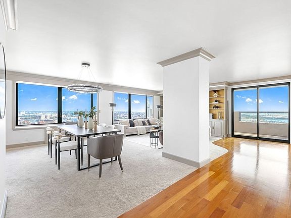 This spacious 3-bedroom PLUS DEN, 3-bath residence offers breathtaking ocean and skyline views from its perch above Boston Harbor. The expansive living and dining area opens to a private balcony, offering sweeping vistas of the harbor and city—perfect for both relaxing and entertaining. Each of the three generously sized bedrooms is complemented by a luxurious, state-of-the-art bathroom featuring jacuzzi tubs and bubble massage soaking for a spa-like experience. The chef’s eat-in kitchen provides captivating views of the Boston skyline, making every meal memorable. Additional features include gleaming hardwood floors, recessed lighting throughout, and an in-unit washer and dryer for everyday convenience. Residents enjoy a seasonal, oceanside heated pool—an ideal retreat for both homeowners and guests. The professionally managed building includes a 24-hour concierge, on-site management office, and available rental parking.