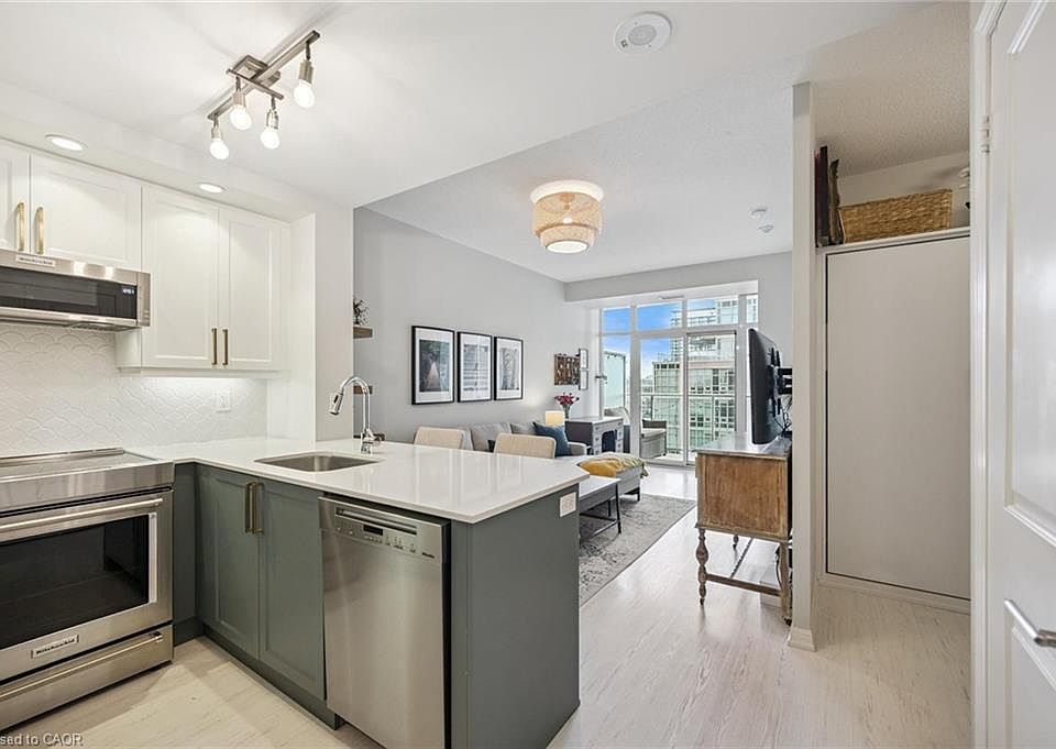 Moving to Toronto? Welcome to Liberty Village, the perfect blend of sophistication, style and fun! This updated 1 bedroom + den, 1 bathroom condo offers over 600 sq ft of thoughtfully designed space, perfect for urban professionals, couples, or anyone looking to enjoy one of Toronto’s most dynamic neighbourhoods. The unit features a modern kitchen with custom cabinetry refaced with a fresh new backsplash (2021) and all the appliances replaced in 2020, including an induction stove, low-profile microwave, fridge, and Miele dishwasher. There is convenient in-suite laundry with a washer and dryer (2020) and a versatile den with a built-in Murphy bed (double) and California Closets for extra storage - ideal for a home office and guests. Custom closets in the bedroom, entryway, and den make storage smart and simple. Enjoy lake views from your private balcony and yes, BBQs with propane are allowed! This unit includes a storage locker, and 1 parking spot located right next to the elevator for ultimate convenience. The building has everything, 24-hour concierge service, an indoor pool, bowling alley, games room, golf simulator, movie theatre and a recently renovated gym and rooftop party room. There are also guest suites and visitor parking. The neighbourhood features 3 grocery stores, LCBO, banks, restaurants and cafés, all within walking distance. It is close to BMO Field (TFC games) and Budweiser Stage and steps to Exhibition GO Station, TTC, and the lake (a 15 minute walk away). Also, this is a super dog-friendly community with nearby parks and pet-friendly businesses. This condo offers the perfect mix of comfort, convenience, and lifestyle. Book a showing to see for yourself.