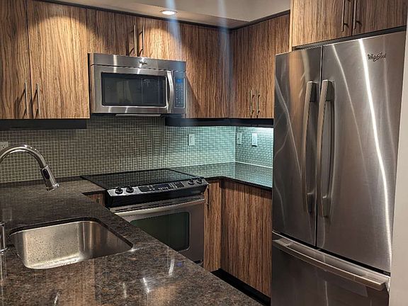 High ceilingsLaminate floorsFloor-to-ceiling windowsModern kitchenPremium stainless steel appliancesSleek cabinetryGranite counter