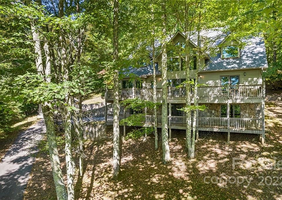 Fabulous mountain home at hi elevation. This home is situated on 3.XX acres w/green space, one of the largest lots in Wolf Laurel. Home features wood floors, vaulted, tongue and groove ceilings, with a massive, stone, gas log fireplace, and a formal dining room with long windows and views. Master on main features double sinks, with a jacuzzi tub, with deck access and long range views. There is a detached garage and work shop. There is also a second garage, two cars and attached to the main level The upper level open to the great room with two master suites. Lower level has a family room with a wood burning fireplace, wet bar and mini fridge, full bath, bonus room/bedroom, mechanical room and generator. Furniture conveys. New roof in 2022 and a paved driveway! Non brokers must be accompanied for sec gate. Most amenities require paid, voluntary membership, except ski slopes and horses. Acreage per tax records
