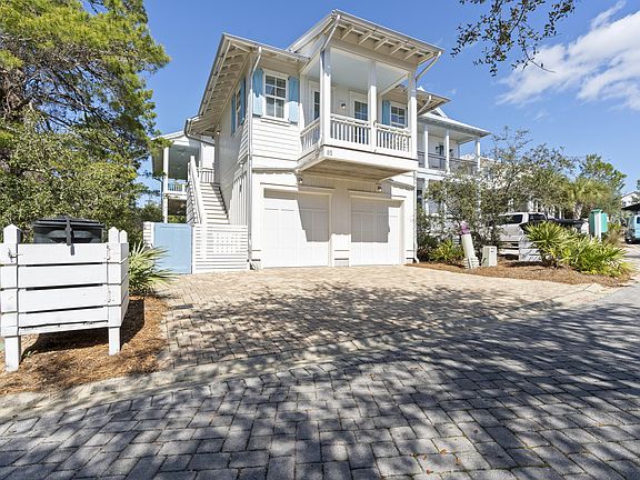 Designed by renowned architect Tom Christ of Christ & Associates and expertly built by Artisan, this beautifully crafted 4BR/4BA cottage-style residence is nestled in Blue Mountain, right off 30A. A 1BR/1BA carriage house sits in front of the 3BR/3BA main home, creating a private courtyard between the two structures for a peaceful, secluded feel.The main home features expansive covered porches perfect for relaxing, while the carriage house adds its own private balcony. Inside the main residence, the reverse floor plan offers a spacious master suite and guest suite on the ground floor, welcoming you with shiplap accents and durable stone flooring--ideal for beach living.On the second level, an open-concept living and dining space is bathed in natural light, complemented by tongue-and-groove ceilings, wide-plank hardwood floors, and a calming neutral palette. The fully equipped kitchen stands out with premium Caesarstone and LG Hausys quartz countertops, a large center island, stainless steel appliances, white cabinetry, and a striking subway tile backsplash that stretches to the ceiling. A guest bathroom featuring a soaking tub completes this floor.