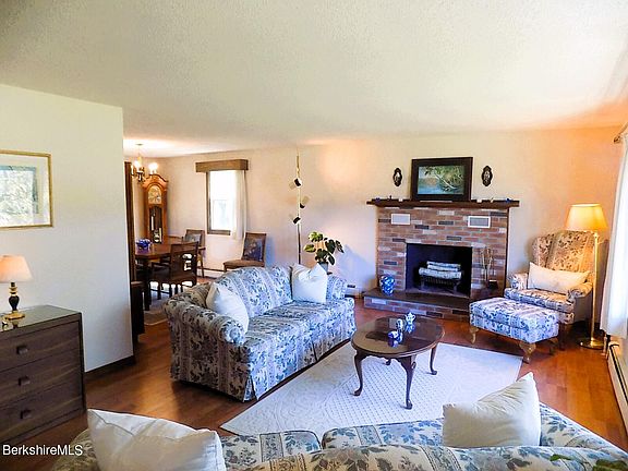 Must see views! Poised at the highest point of the prestigious Highfield Drive neighborhood, this property offers an enchanting panorama of Mount Greylock from the back porch and kitchen. While the living room's bay window reveals a breathtaking view of the rolling hills of southern Berkshire county, this view is also shared by the formal dining room. Indulge in the cozy warmth of two wood-burning masonry fireplaces, complete with vented Heatalator inserts, nestled in the living room and lower-level family room, adding both charm and comfort to your evenings. A sun-drenched three-season porch extends gracefully from the dining room, leading to a serene back patio, perfect for basking in the tranquility of the surrounding landscape. Centrally located eat-in kitchen has convenient access to the finished lower level. The primary bedroom has an ensuite with walk-in shower. Two secondary bedrooms share same magnificent southern views as living room. A double sink main bathroom is off the hall. Discover a wealth of additional living space, including ample storage, a spacious family room, a sizable laundry room, and a convenient mudroom area granting entry to the attached two-car garage. The generous flat backyard has potential for just about anything from gardening, star gazing, a game of catch or socializing. Lovingly cared for by one original owner, this three bedroom, two bath ranch is waiting for the right buyer."