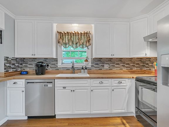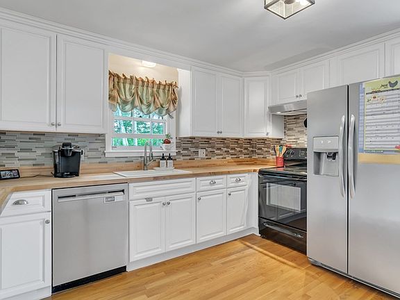 Beautifully updated home in perfect neighborhood setting! * Gorgeous remodeled kitchen with bright white cabinets, stainless appliances including French door refrig with water/ice dispenser, butcher block counters, glass tiled backsplash & breakfast bar! * Large formal living room with stunning fireplace surrounded by an elegant mantel, pellet stove insert & 5 panel bay window! * Bright & sunny dining area with replacement slider door to deck! * All bedrooms on the same floor with plenty of closet space! * Gleaming hardwood floors throughout! * Lower level offers huge family room with recessed lighting plus separate & private office/workout room too! * Unfinished walk out basement area with lots of storage space! * So many updates to this home including roof, vinyl siding, replacement windows, elec panel, efficient tankless boiler, oil tank, gutter leaf guards & double wide driveway! * Storage shed! * Relax on the large 24’x10’ deck overlooking your very private & fenced backyard!