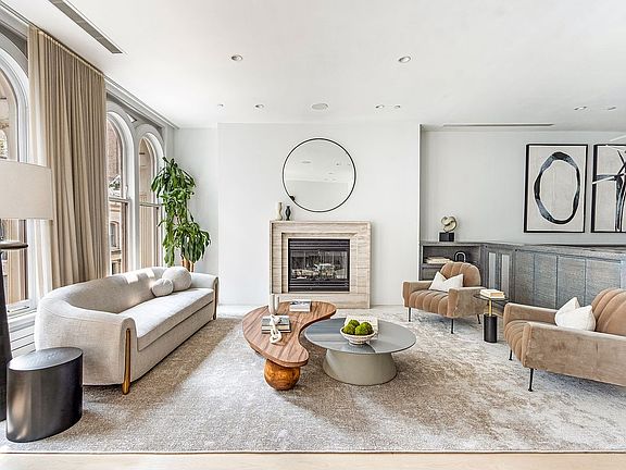 Arrive by private key-locked elevator into a 31’ x 23’ great room with 10ft ceilings, fireplace, and signature arched windows. A skylit staircase anchors the home, flooding it with light from three exposures.