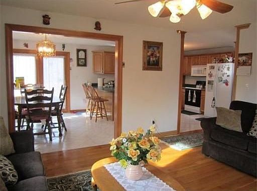 Wonderful home in private wooded setting at the end of a dead end street with open concept livingroom, diningroom & fully applianced oak kitchen opens to a 20X12 exterior deck, First floor laundry, with washer & dryer , Bow windows, hardwood floors, ceiling fans in almost all rooms, Central air, 2 car garage, lots of off street parking. Come and see it today.This young home is ready to move into in great shape and the location is a natural settting. See it today!