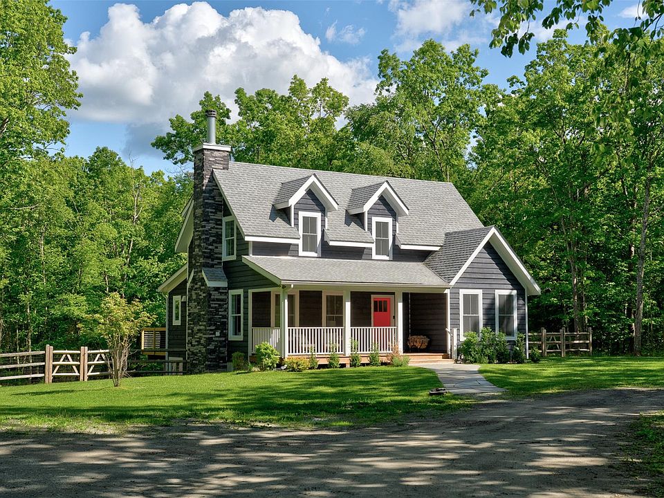 A gracefully curved driveway delivers a lovely reveal: a classic-yet-modern Catskill Farms home, quietly nestled on 5 private wooded acres. Thoughtful site placement allows the house to bask in sunlight while remaining discreetly tucked into its forested surroundings—a careful balance between openness and seclusion.