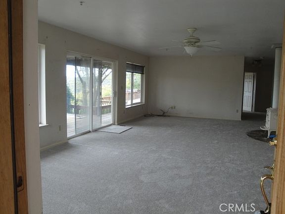 Once inside you will find a newly carpeted large Living area with a wood stove for those chilly days that opens to a large deck with great views of Lake Oroville for great get togethers with family and friends. The large eat in kitchen has custom butcher block counter tops with plenty of storage. Off the kitchen you will find a good sized formal dinning room. The guest bedroom has a nice size closet and private access to the tiled hall bath. The large primary bedroom has a French door for out door access, a good size walk in closet with built in shelving and a master bath with a large tile shower.