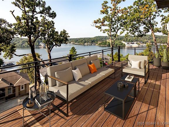 Stunning new modern home with breathtaking views located in Linn Creek Cove! With 3 beds, 3.5 baths, & 2.5 car garage. This 3,636 sf home features exquisite maple hardwood flooring, gas fireplace, designer kitchen with premium cabinetry & gas cooktop, metal roof, and Quaker aluminum windows maximizing the panoramic lake view which faces south. Each bedroom boasts a walk-in closet, custom tile onyx bathrooms and sleek quartz countertops. Enjoy the expansive composite hardwood decking on both levels, complemented by a custom cable deck railing, and the durability of prefinished metal roofing and energy-efficient Diamond Coat Siding. Each level has their own laundry room as well. Additional room on the lower level could be a nice wine cellar. Large safe room/storage. So many great features! Assessments are paid every 6 months.