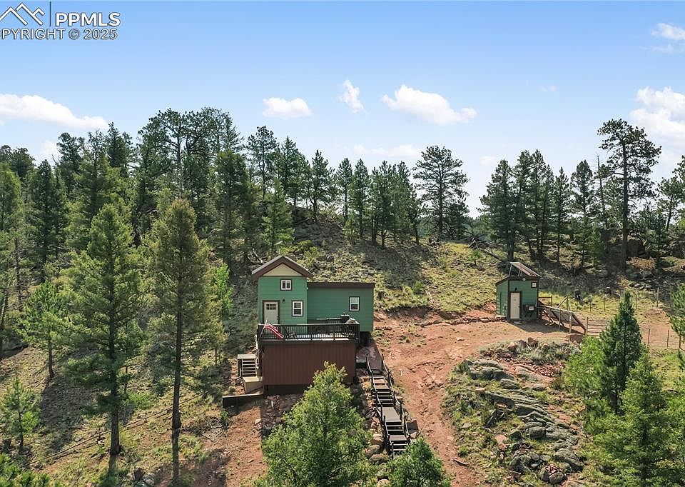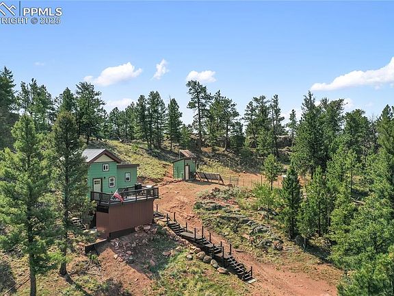 Super Unique 100% Off-Grid Mountain Retreat. If you’re looking for a remote lifestyle or the ideal outdoorsman's getaway; this property is it. Nestled among striking rock formations with mountain views, this home offers true solitude and the raw beauty of the Colorado wilderness. Large deck overlooking the valley is perfect for sunsets, stargazing and wildlife viewing. Home Includes: complete solar power system w/backup generator, cistern, composting toilet and everything you need to work remotely; including Starlink. Comfortable layout with fully equipped kitchen, loft bedroom, living room w/ pellet stove and blue pine throughout. Additional features: Small A-frame cabin w/deck, RV site w/1200 gallon cistern, loft shed, chicken coop, dog kennel and separate septic tank that is not currently hooked up to the house. This property is ready for anyone who wants to enjoy life at a slower pace. Located one hour from Colorado Springs and only 30 minutes from Colorado’s famous Dream Stream. You'll hear the wind, the birds, and little else.
