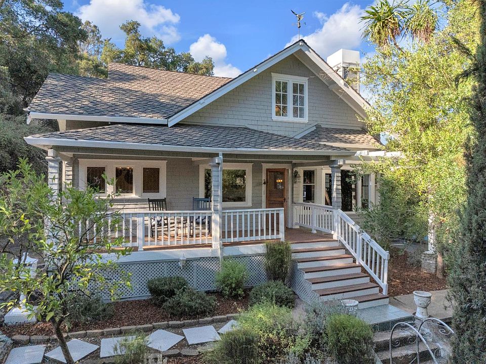 A timeless Craftsman masterpiece nestled on a sprawling over 1/2 acre lot with breathtaking views, just steps from vibrant downtown Morgan Hill. This exceptional home is the perfect blend of classic character, modern comfort, and a truly unbeatable location. The entertainers dream outdoor kitchen and elevated deck overlook rolling hills and sparkling city lights, creating a private resort experience complete with a two-tier black concrete bar, dual refrigerators, kegerator, range, undermount sink, and two Bromic Tungsten Smart Heaters for year-round enjoyment. An awe-inspiring front porch leads inside to rich hardwood floors, crown molding, and custom wainscoting that highlight the stunning living room and executive office framed by tapered columns and a wood beam. The formal dining room features an original pocket door, built-in buffet, and a beautiful chandelier. Two downstairs bedrooms include fully remodeled ensuite baths with designer tile and frameless glass showers. Upstairs, dual primary suites each offer their own distinctive character. One with an oversized farmhouse door, dual closets, fireplace, and modern shower with skylight views; the other with warm wood detail, soaking tub, and dual vanities. Timeless elegance meets modern living in this extraordinary estate.