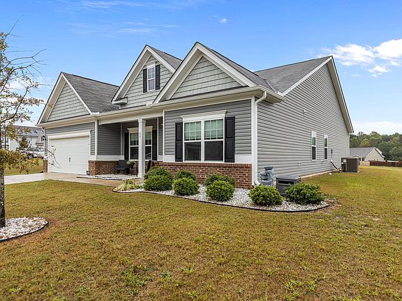 Impeccably designed and better than new, this 3-bedroom, 3-bath home delivers comfort and style at every turn. Built in 2021, it offers a true split layout where each bedroom enjoys private access to its own full bath — an ideal setup for guests or multigenerational living. High ceilings, LVP flooring throughout (no carpet!), and abundant natural light create a bright, airy atmosphere. The open-concept living area seamlessly connects the formal dining room, eat-in kitchen, and great room. A chef's delight, the kitchen boasts granite countertops, generous prep space, and built-in blinds for effortless light control. Retreat to a massive primary suite with its own romantic floating fireplace, an oversized walk-in shower, dual vanities, and a dreamy walk-in closet with direct access to the laundry room. Outside, perfect curb appeal and a manicured lawn frame the pristinely maintained 2-car garage home. Truly move-in ready and waiting to impress!