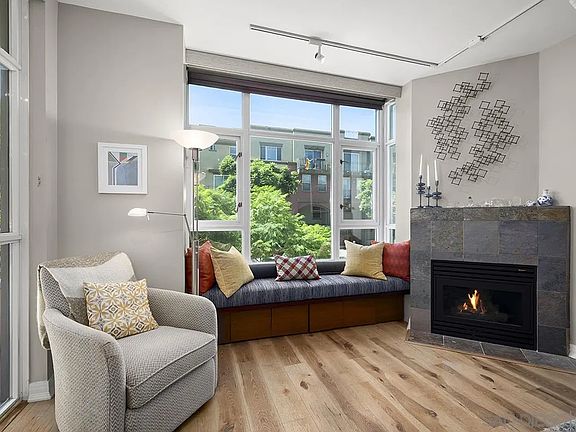 Cozy fireplaceWest-facing end-unit residencePrivate balconyRemodeled guest bathExpansive windowsSpacious primary suiteCalacatta quartz countertops