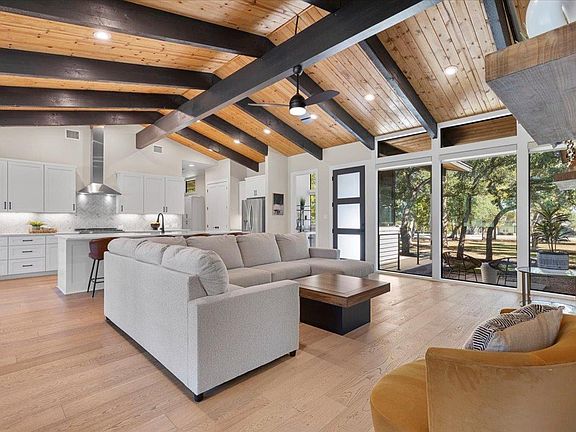 Experience the perfect fusion of sophisticated architecture and serene Hill Country living in this mid-century modern masterpiece, set on approximately a one-acre lot in one of Dripping Springs' finest gated communities of Bunker Ranch! This single-story jewel offers an exquisite blend of elegance, privacy, and effortless indoor-outdoor living. Clean lines, Texas limestone, sleek black accents, and expansive windows create a timeless exterior that feels both elevated and inviting. Mature oaks fill the front yard while multiple patios provide ideal spaces for morning coffee, weekend gatherings, and enjoying the peaceful setting. Inside, vaulted wood-clad ceilings with bold exposed beams, wide-plank hardwood floors, and walls of windows set the tone for warm modern opulence. The open-concept great room flows seamlessly into a designer kitchen featuring quartz countertops, an oversized quartz island, stainless steel appliances, and a herringbone backsplash. A light-filled dining area captures serene backyard views, and the living room is anchored by a floor-to-ceiling limestone wall with an electric fireplace and floating wood shelves. The primary suite is a true retreat with vaulted ceilings, dramatic windows, and a spa-like bath offering dual vanities, an impressive walk-in shower, and direct access to a generous walk-in closet with wood flooring. Additional bedrooms are bright and thoughtfully designed, each with upgraded bathrooms featuring contemporary fixtures and stylish tile selections. A private home office with soaring windows, a versatile secondary living area, and two laundry areas add to the home’s exceptional functionality. Located just minutes from top-rated Dripping Springs schools, boutiques, dining, wineries, and Hill Country amenities, this home delivers luxury, privacy, and soul in one of the area’s most coveted communities. Don't forget to check out your back neighbors featuring Bo the longhorn and his cattle gang!