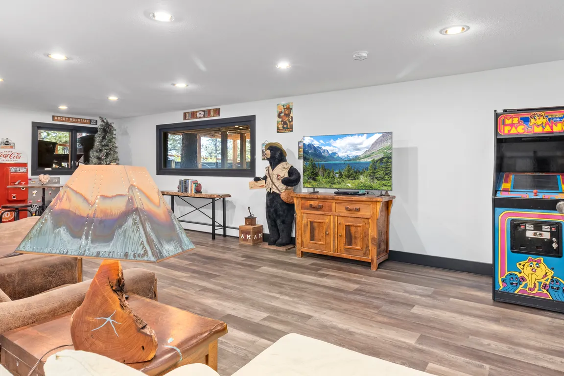 Small barnFruit treesFlower and veggie bedsFire pitExpansive deckDining roomVaulted knotty pine ceiling