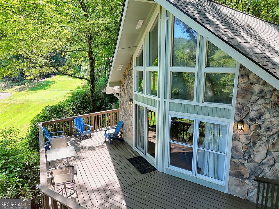 Follow the paved, winding driveway, through a Rhododendron Thicket, to this adorable Chalet, overlooking the 14th Fairway in Sky Valley, GA. This 3 Bedroom 2 Bathroom home welcomes you with a Stone Walkway. Once inside, you will find pecan floors throughout the main living area, a rock fireplace, wooden beams at the vaulted ceilings, and a spiral staircase to the Master Suite. The Living Area offers Floor to Ceiling Windows, where you can take in the views of the Beautiful Mountains and the Manicured Golf Course. On the main floor, there are 2 good-sized bedrooms, an updated Kitchen with nice appliances and Solid Surface Countertops, and a recently added full bathroom with a Walk-In Tiled shower and Double Vanities. There is a large front deck overlooking the Fairway, with plenty of space for entertaining. Off the kitchen is a Screened Porch, sitting above a small, noisy stream complete with outdoor furniture for napping, as well as a TV. This property offers all the modern conveniences plus, with almost an acre of wooded land, you have the privacy to relax in your own Mountain Oasis. This home is being offered mostly furnished with beautiful, almost brand-new furniture, excluding family heirlooms and personal items. Sky Valley Golf Club offers many levels of membership and there is no mandatory HOA required for you to join. Amenities include Golf, Pickleball, Croquet, Tennis, a Community Pool, Private Restaurant, and Exercise Facility. This community is surrounded by nature with lakes, waterfalls, and walking trails that are free to enjoy. It is only 20 minutes to Clayton, GA or Highlands, NC and within 10 minutes of Highlands Outpost for Snow Tubing & the Alpine Coaster and Highlands Aerial Park for Ziplining in Scaly Mtn, NC.