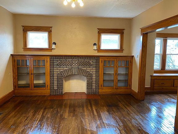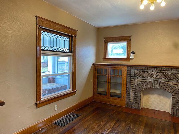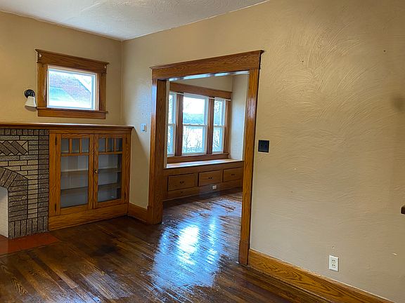 Living room with large mantle, dining room with large windows and bench. Eat in kitchen with lots of cabinets.