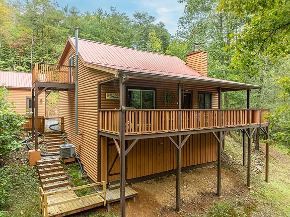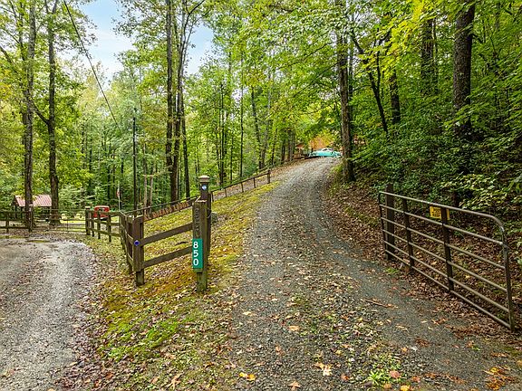 This incredible North Georgia retreat is a rare, one-of-a-kind find, offering an exceptional blend of rustic charm, complete privacy, and modern amenities, making it perfect as a primary residence, weekend getaway, or investment property (currently used as a short-term rental). This 2-bedroom, 2-bath quintessential log-sided cabin home offers 1,408 sq. ft. of living space and beautiful pine flooring throughout its tongue-and-groove wood interior. The home resides on a tranquil 4.91-acre estate with approximately 1,000 feet of noisy, chattering stream frontage, featuring two rushing streams that converge just below the front porch, and uniquely, the property owns both sides of the stream. You won't see a single neighbor, yet you are only minutes from the charming towns of Ellijay and Blue Ridge. The kitchen was completely remodeled in 2022, and the home features a spacious master bedroom on the main level. The upstairs bedroom is also very spacious and now boasts a full bath and a balcony with incredible views of the stream. Outdoor living is maximized with wrap-around decks and a separate large pavilion featuring an 8-foot-wide fire pit and a gravel path leading to the stream convergence point. The property includes a substantial 4-car, 760 sq. ft. barn/garage/workshop/game room with log siding, a cast iron stove for heat, and two garage door openers, plus a metal storage shed. Additional value comes from the unique yard art—a 1950 Cadillac, a 1950 Dodge pickup truck, and a totem pole—all included with the property, as are the home furnishings (minus personal belongings). A charcoal water purification system has also been added by the sellers. The gravel road to the property is easy to navigate.