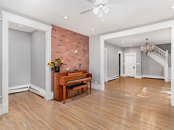 Charming Victorian in the sought-after Aurora University area. Features 10' ceilings, hardwood floors, leaded glass windows, and lots of details, including a pocket door and original woodwork. Large bedrooms with walk-in closets (rare for this age home), enclosed front porch, back mudroom, and full basement. Recent updates include 2024 water heater, 2024 forest green 6" gutters with extenders, refinished living room floor, new main level bath fan, new plumbing under the kitchen sink, and shower. The roof is newer. Nice-sized yard with perennials, a side drive, and patio.