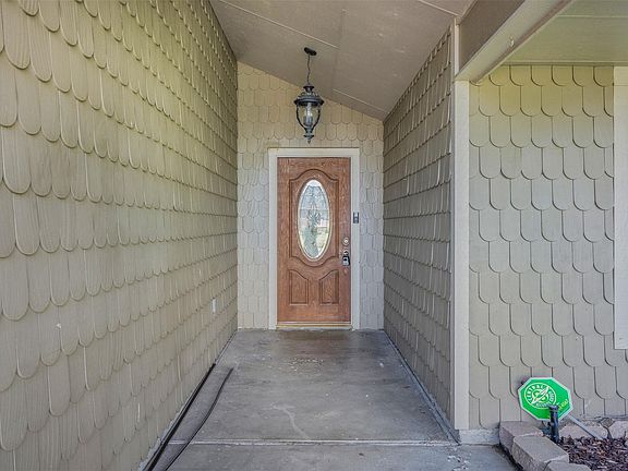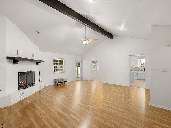 Brick corner fireplaceBrick accent wallSpacious kitchenEnsuite bathroomSprinkler systemThree mature live oaksCovered back porch