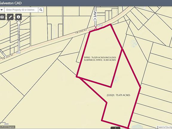 Situated in Flood Zone X, the property has minimal flood risk. Conveniently located on FM 2004 with 945 feet of frontage for easy access. Avenue C extends into the property from FM 2004, ensuring accessibility and potential for further development.