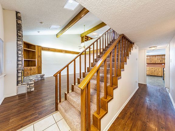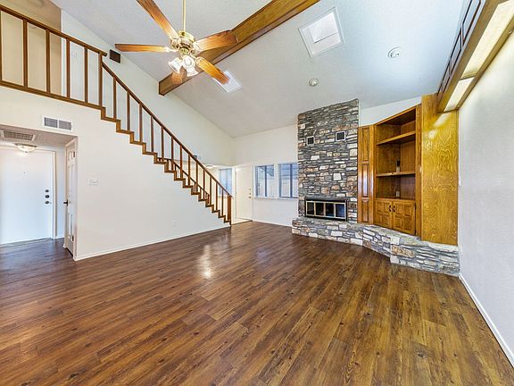 Huge 2 Bedroom, 2.5 Bath, 2 Car Garage! Living Room has a fireplace with built-in TV cabinet and up lighting along living room wall. The dining room has built-in cabinets with glass doors/adjustable shelves and counter area. Kitchen has a built-in desk, recently installed appliances, wine fridge and LOTS of counter/cabinet space. Downstairs half-bath for guests. There is a 2nd living room upstairs with adjustable built in shelves. The master bedroom has 2 ceiling fans, HUGE walk-in closet, double vanity, linen closet and a separate water closet with shower only. The second bedroom has its own bathroom with nice cabinet/counter space and a nice sized walk-in closet as well. There is a covered patio and wood deck to the backyard. The garage is over-sized with extra space and built in shelf as well as a sink and washer/dryer connections with cabinets!