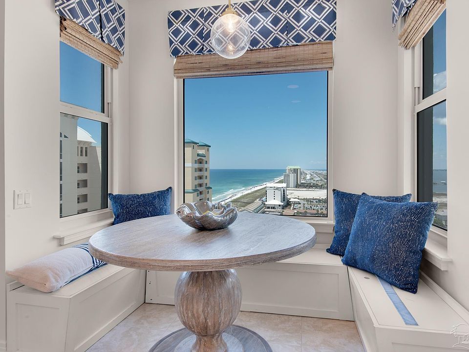 Skyview Penthouse invites you to experience the best in waterfront living on the Gulf. Furnished 3-bedroom, 3-bath West Corner Condo on the 18th floor at Beach Colony West is ideal for primary residence, second home or investment Vacation rental. The wall of windows brings in an abundance of natural light and offers refreshing views of the white sugar sand beach and turquoise waters of the Gulf coastline. Open concept 1950 sq feet has been thoughtfully designed with high 9-ft ceilings, crown molding, neutral color palette and spacious living area that flows directly into the expansive covered waterfront terrace. This updated condo is appointed with beautiful low maintenance tile flooring on the diagonal and updated furniture, lighting fixtures, paint, and décor. The dining area, breakfast bar and breakfast room allow for both casual and formal dining options. The breakfast room has large picture windows giving both western and northern views of the Santa Rosa Sound. The updated kitchen is fully equipped with stainless appliances, granite counter tops, and tall cabinets. The Master ensuite has terrace access, double door entry, large walk-in closet, bath with double vanity, tiled shower and jetted tub. The second guest bedroom features a King bed, private bath with shower and views of the Sound. The third bedroom includes two queen beds and full en-suite bath with additional access from hallway for family and guests. Gated Beach Colony West resort-class amenities include Olympic sized pool, elevated tennis/pickle ball court, a fitness center and gathering room, covered parking & individual storage unit outside each unit. Additional shared storage for kayaks, bikes and stand-up paddle boards. Whether you enjoy fishing from the Gulf coast's longest pier, snorkeling in the reefs, deep sea fishing, or gathering sea shells, this is the place to be! Navarre Beach is only four miles long and one of only ten beaches in the nation protected as a National Seashore.