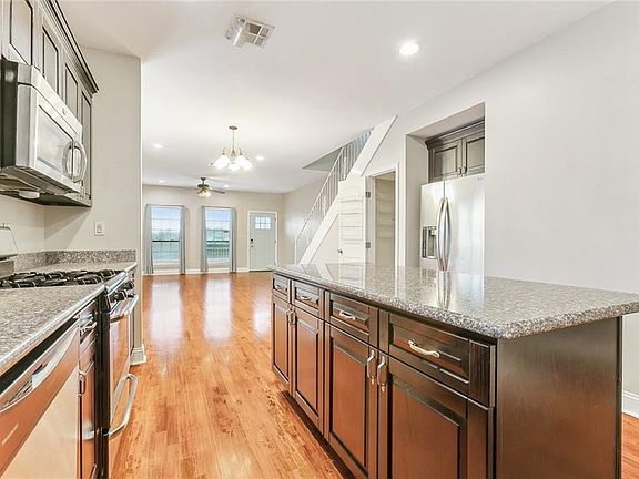 This charming 3-bedroom, 2.5-bathroom home offers over 1600 square feet of comfortable living space. Step inside and be greeted by gleaming refinished wood floors that flow throughout the open-concept living area. The kitchen is a chef's dream, featuring granite countertops, stainless steel appliances, a convenient island for additional prep space or casual dining, and a large pantry to store all your kitchen essentials. The main floor boasts a spacious primary suite, complete with double closets and a luxurious bathroom featuring double vanities. Upstairs, find two additional bedrooms with closets and a large full bathroom. For added convenience, a mudroom located off the side access provides a designated space to drop off shoes, bags, and coats, and features a full-sized washer and dryer, along with additional storage. This home sits on a corner lot, offering extra yard space and a unique vantage point. A vehicle-sized side gate would allow for off-street parking, should you want to put in a parking surface. Centrally located and convenient to I-10, Mid-City, Carrollton, and Old Metairie.