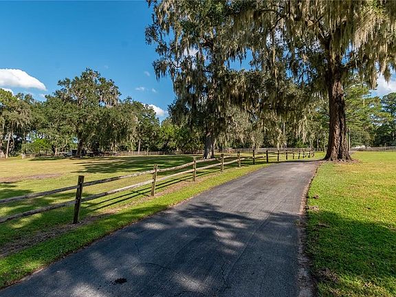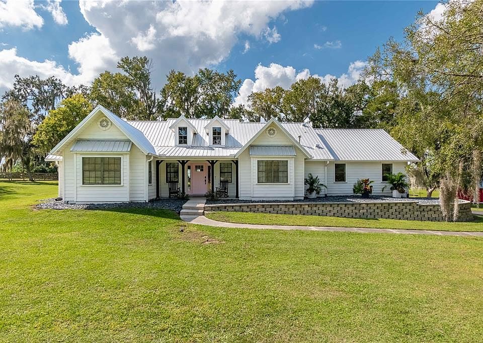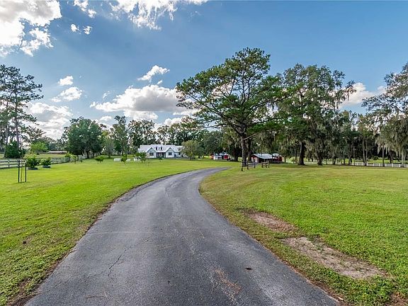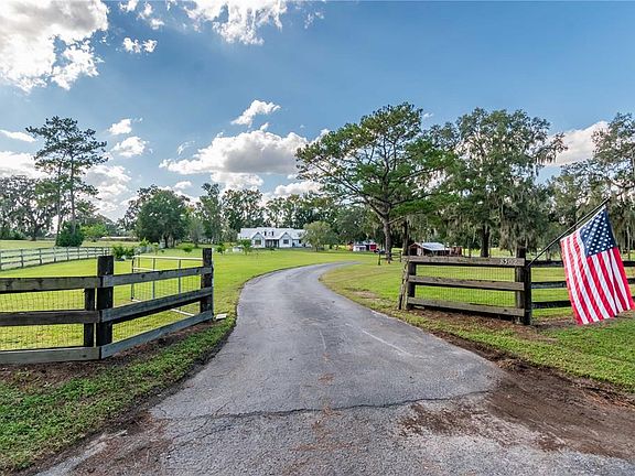 Nestled on 4 acres of picturesque countryside just minutes from the Florida Horse Park and Ocala's conveniences, this private estate blends refined living with agricultural potential. Fenced and gated, the property boasts an open landscape that offers unobstructed views of the surrounding countryside. Set back from the road down a paved driveway, the 4-bedroom, 3-bath farmhouse is a stunning option with a country-style covered front porch and over 2,400 sq ft of space. Inside, the thoughtfully designed home features an open, split-bedroom floor plan with tall ceilings and luxury wood-look vinyl flooring. The living room is incredibly bright and open, with cathedral ceilings that include skylights for abundant natural light. The adjacent kitchen is open for ease of entertaining, complete with stainless steel appliances, a large center island with breakfast bar, extensive cabinet storage, a pantry, and a connected breakfast nook with lovely views of the pool. Just off the kitchen is a full laundry room and connected utility room, which comes equipped with additional built-in shelving for added storage. The primary suite is a true standout, featuring cathedral ceilings, a massive walk-in closet with a built in shelving system, and a private en-suite bath that boasts a spacious garden tub, a glass-door shower, and dual vanities. On the other side of the home, three additional bedrooms are laid out in a way that none of them share a wall, providing added privacy and peace. An additional flex room at the front of the home is a great option for those looking for a formal dining room, den, full office, or anything in between. Step outside to discover the ultimate Florida lifestyle: a sparkling in-ground pool with lighting and surrounding patios perfect for outdoor gatherings or quiet evenings under the stars. Zoned A1 and free from HOA restrictions, the property features a barn with ample room for both equipment or animals, making this a superb option for a hobby farm or potential equine farm if desired. A custom chicken coop, young fruit tree orchard, and raised garden planters are also in place. Located in a quiet, established area with easy access to major routes and Ocala's shopping, dining, and medical centers, this home offers a unique blend of luxury, land, and lifestyle! Don't miss out!