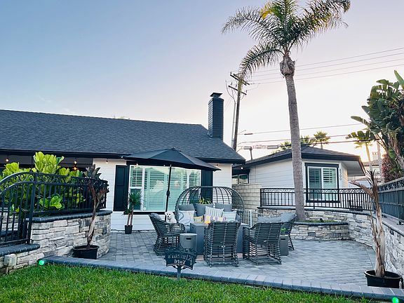 Enjoy this newly remodeled Beach Oasis. Huge open floor plan with wainscot vaulted ceilings, European white oak hardwood floors, seaside white shutters throughout, full kitchen with crisp white quartz countertops ,white shaker cabinets and spectacular farm sink. Enjoy time with family and friends at the Walnut Island counter while watching the sunset out the kitchen garden window. Four fabulous bedrooms with coastal ceiling fans and wainscot ceilings. Each room is meticulously decorated to inspire emotions of a fresh sunny seaside vacation. The remodeled restrooms include spacious open showers with relaxing tubs. Step outside to a patio and grass garden in the front, or swing in the hanging wicker chairs. You will find plenty of comfy seating and fire pits throughout the outdoor areas, where you can chat with friends and family or just cuddle up on cool summer nights. The backyard is west facing and has amazing summer sunsets with palm tree silhouettes. Large 6 person Hot tub, hotel style heated pool, large stainless steel barbecue island, outdoor dining table and cozy outdoor lounges nestled into every corner. The parking is abundant on the custom paver driveway and spacious two car garage. If boredom sets in, walk to the beach and grab a cocktail at The HB House only half mile away. Take a bike ride on the most beautiful boardwalks on the west coast and venture to the Huntington Beach pier. While you're there, stop by for a bite to eat or a refreshing summer cocktail downtown Huntington Beach on the famous Main Street.