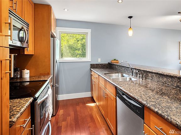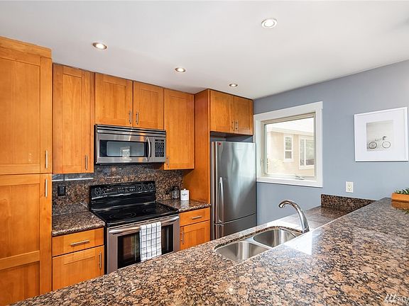 Newly renovated top floor 701 sqft condominium, this 1 bedroom & 1 bath unit features an updated kitchen with cherry cabinets, granite counters, & SS appliances. Freshly painted and carpeted throughout, radiant heated bathroom floors & new in unit washer/dryer combo. The Large master bedroom features two closet with plenty of room for storage. One uncovered assigned parking spot. Located close to Shopping, restaurants, schools and easy access to I-5. The perfect place to call home!