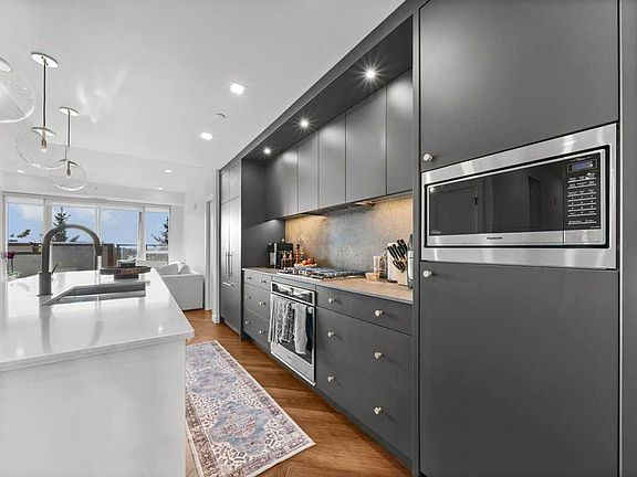 Floor-to-ceiling windowsChevron-patterned luxury flooringAbundance of natural lightOpen-concept layoutChef-inspired kitchenQuartz countertopsFull-height soft-close cabinetry