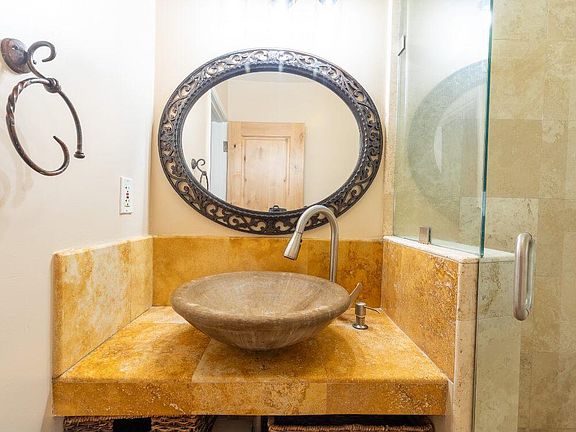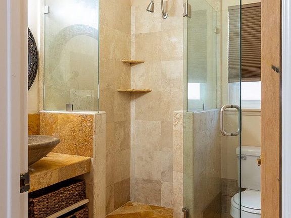 Private gated entranceStone vessel sinkElegant bathroomWalk-in glass showerWhite countertopsBright open layoutUpdated kitchen