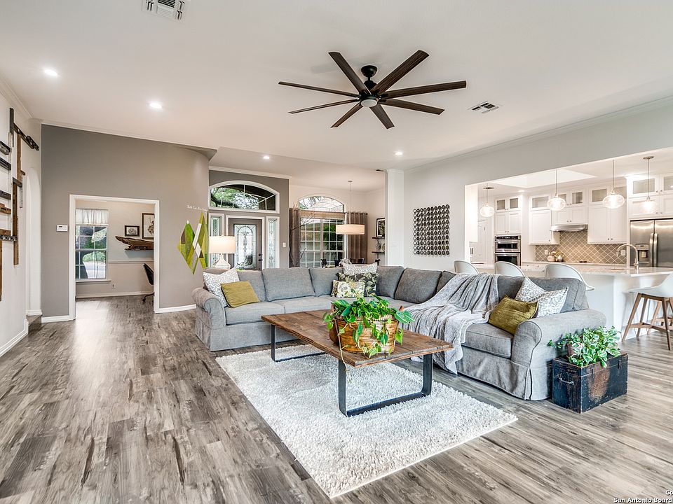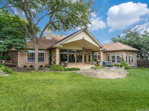 Welcome to this immaculate, remodeled home nestled on a spacious, tree-filled lot in a quiet cul-de-sac near the Fair Oaks Ranch Golf Course and Country Club. This 3-bedroom, 3-bathroom home features a private en suite in every bedroom, offering ultimate comfort and privacy-plus a dedicated study, perfect for a home office or flex space. The modern kitchen is a chef's dream, featuring quartz countertops, crisp white cabinetry, a sleek cooktop, built-in wine fridge, refrigerator, and upgraded sink and faucet. The open-concept living spaces are filled with natural light from oversized picture windows overlooking the beautifully landscaped backyard. Step outside to your oversized covered patio-ideal for relaxing or entertaining-complete with a hot tub surrounded by mature trees for ultimate privacy and tranquility. Luxury vinyl plank flooring and plush carpet in the bedrooms were installed in 2020, combining style and comfort throughout. Personal touches throughout this home give it a warm and cozy feel! A storage shed in the back with electricity offers flexibility for additional work or storage space. This home truly has it all: modern upgrades, thoughtful design, open concept, and a prime location just a golf cart drive from the Fair Oaks Ranch Golf Course and Country Club. Membership is required to access all that the Fair Oaks Ranch Country Club has to offer. Zoned for the highly rated Boerne ISD schools and close proximity to San Antonio make this location the best of both worlds!