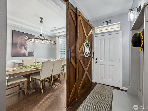 Gas fpGourmet kitchenFarmhouse sinkBarn door accentPrimary suiteTray ceilingHuge walk-in closet