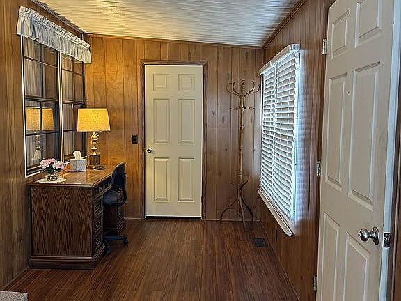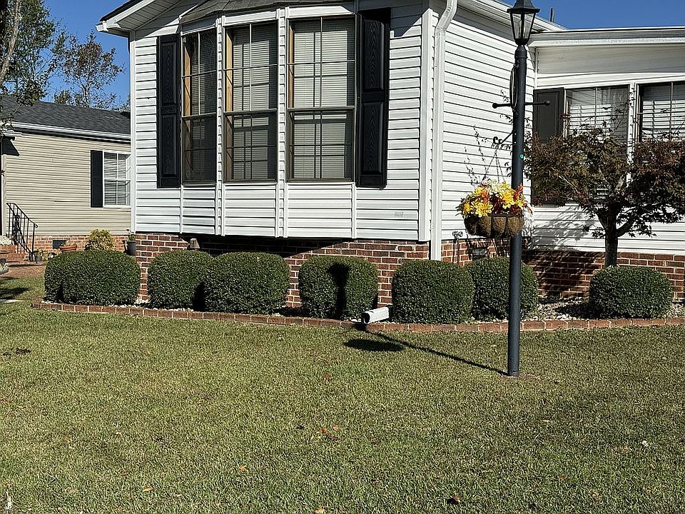 Brick underpinningCustom paintNew architectural roofSolid surface countersKitchen has wood cabinetsSmall enclosed back porchPlenty of storage space
