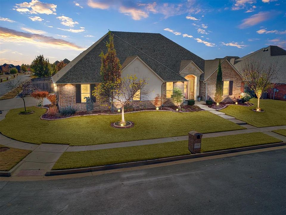 The backyard shines with an expansive patio, vinyl-lined, salt water sports pool with 4 fountains & volleyball setup, freeze protection & solar cover. PLUS an outdoor shower, & outdoor kitchen ready for celebrations or quiet evenings!