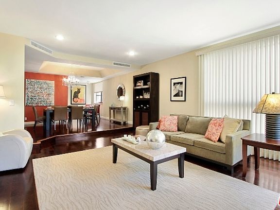 Spacious and Elegant and Updated single unit with a large wrap around patio. Elevator access from foyer of the building to the garage level. Two car side by side private garage w/ storage cabinets. Double door formal entry and only one common wall. Beautiful hardwood floors that transform this home into a stylish space. Step down open living room, recessed light throughout, remote controlled fire and ice fireplace, crystal chandeliers in dining and master bath. Sleek kitchen w/solid surface countertops, stainless steel appliances, gas stove and wine cooler. Luxurious formal dining room w/ tray ceilings, breakfast area overlooking greenhouse window, separate laundry room w/ storage, heat pump unit provides heating and AC, generous master suite w/ sitting area and large walk in closet w/ storage system, Master bath with separate soaking tub and glass enclosed shower, dual sink and great use of travertine countertops and flooring. Located in the zoning of Roosevelt Elementary School.