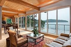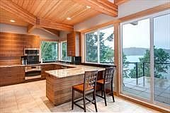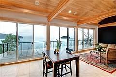 Exceptional home with unobstructed water views perchedabove the waters' edge. This new custom home features adesigner kitchen complete induction cook top, stainless D/W,microwave, granite countertops, backsplashes and unparalleled waterviews. Throughout the home are exposed wood beam ceilings, floor toceiling windows, gas fireplace, tiled floors, surround soundsystem, radiant floor and on demand hot water. The master en-suiteoverlooks the water; the bath is a spa like experience with dualsinks, large shower with dual heads, spacious walk-in closetcomplete with front load W/D. The expansive patio comes completewith BBQ and for the outdoor enthusiast the home posses a launchfor canoes and kayaks. The artistic bulkhead also leads to a patiojust above sea level. The home is fully furnished including cookwear and linens. Utilities include water, trash, recycling, gas,yard care, housekeeping services, high-speed internet and cable.Sorry pets are not permitted.