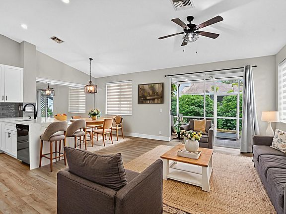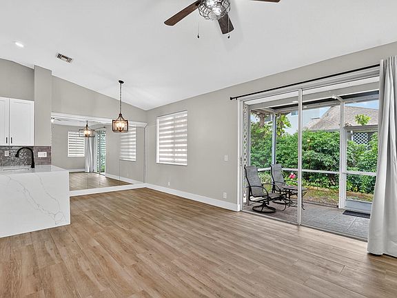 WOW!! Updated 2-Bed/2-Bath Corner Villa w/ 1-Car Garage!Move-in ready corner unit featuring vaulted ceilings and wood-look tile throughout. Updated kitchen with quartz waterfall counters, subway tile backsplash, stainless steel appliances, white cabinetry, and recessed lighting. Spacious open living & dining areas. Large primary suite with vaulted ceiling, walk-in closet, and remodeled bath with frameless shower & modern vanity. Generously sized 2nd bedroom with French door entry and adjacent updated full bath. Laundry/utility room inside. Screened patio, large side yard & backyard. Accordion shutters, newer roof, new blinds, fixtures, and fans throughout. Community offers pool and ample guest parking.