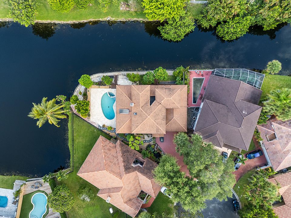 WATERFRONT PARADISE with stunning views from every room! Enjoy 140' of water frontage with NO need for FLOOD INSURANCE. This 2-story, 5-BEDROOM retreat features dual master suites, one on each floor, each with separate tubs and handicap accessible walk-in showers. The home boasts a central atrium and skylight for abundant natural light, a NEW plug-in-home generator, and a SOLAR-powered 80-gallon water heater. Outside, discover terraced landscaping, many fruit trees, and a modern SALTWATER pool with an XL travertine party deck. Additional highlights include a NEW central vacuum system, a peaceful garden, and exterior walking path. With low HOA fees covering lawn care, hedges, and bulk pickup, this gem offers tranquility and convenience. Don't miss out--schedule your viewing today!