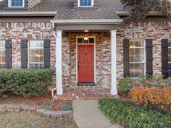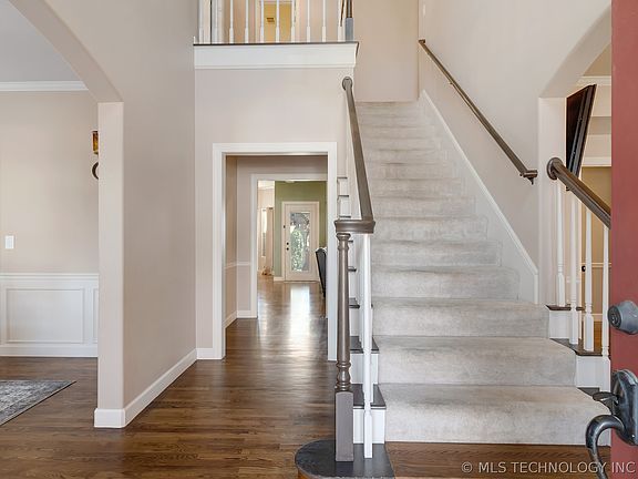 Great floor plan in Jenks schools. 4 living areas, one could be 5th bedroom. Media room with seating, screen and equipment that remains. Formal dining. butlers pantry, washer, dryer and refrigerator stay. Hardwoods, fireplace, built in bookshelves. Large master with whirlpool tub. Storm shelter, must see!