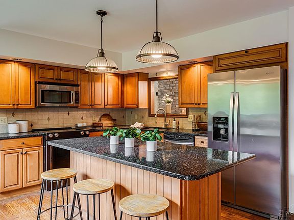- Features: Planning Desk, Counter Bar, Eat-in Kitchen, Walkout, Kitchen Island, Wood Cabinets, Wood Floor, Marble/Granite/Slate