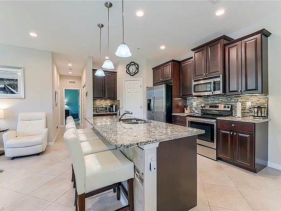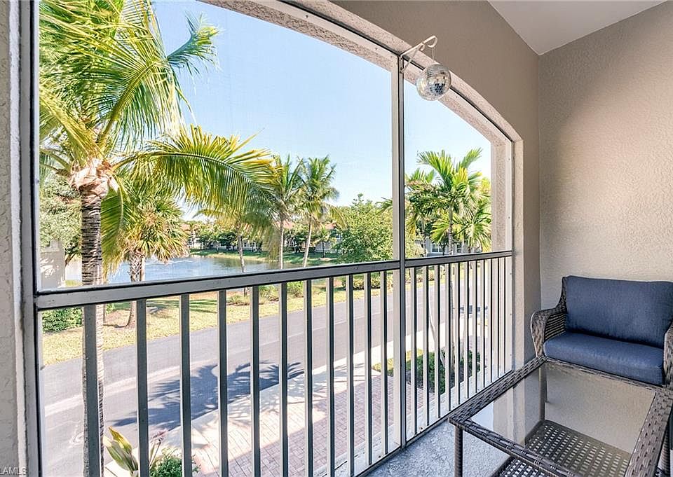 Luxurious LAKE VIEW End Unit in Mirasol at Coconut Point RARELY AVAILABLE and highly sought-after, this Heron floor plan offers a stunning lifestyle with a premium lake view. This spacious 2-bedroom, 2-bathroom end unit delivers abundant natural sunlight and superior privacy, with no neighboring building on one side. New Air Conditioning unit installed 2025! Step inside to discover a beautifully upgraded space featuring: Gourmet Kitchen: Equipped with granite countertops, 42" wood cabinets with under-lighting, a glass backsplash, and stainless steel appliances. Elegant Flooring: 18" tile on the diagonal throughout the main living areas. Ultimate Protection: All windows are impact resistant, eliminating the need for hurricane shutters. Convenience: Includes a dedicated extra storage closet in the attached garage and conveniently located guest parking right next to the building. Mirasol at Coconut Point is a quaint, gated, maintenance-free community offering exceptional resort-style amenities: Heated Resort-Style Pool with a cascading waterfall. Covered Spa, Clubhouse, and Community Room. Fitness Center and Billiards. Unbeatable Location! Enjoy the ease of being within walking distance to the premier shopping, dining, and entertainment of Coconut Point Mall. You're also just a short drive to the Gulf's finest beaches and SWFL International Airport. This exceptional home won't last long. Schedule your private appointment today!