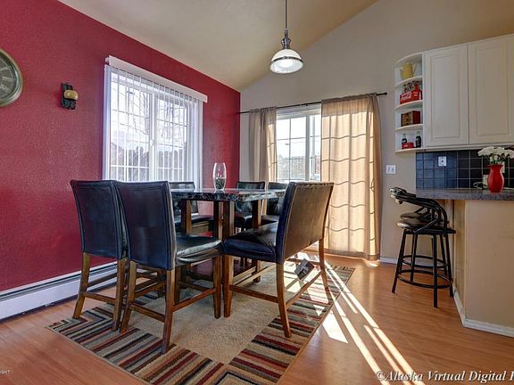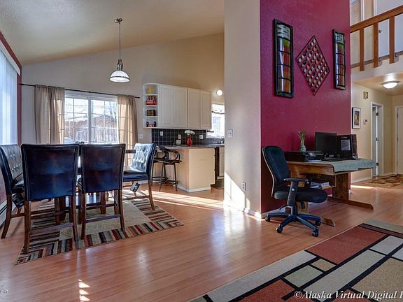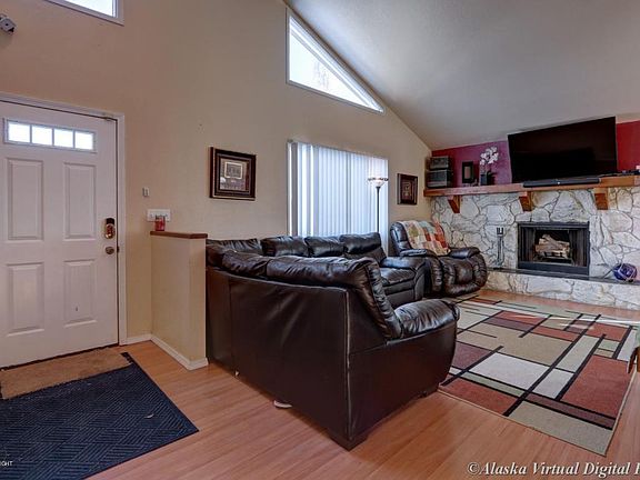 Fantastic Home with great mountain views. This property boasts quality of life with newer fixtures, roof (2007), open living area and a Huge master upstairs with huge deck. This spacious home has an awesome floor plan! Big quiet back yard for the family to enjoy and entertain with big BBQ's. Large shed!Fresh paint on outside window trim. Great location close to JBER! ALl Lights have been changed to led. The city will be installing new curbs and fixing the end of drive way seller says. BTV