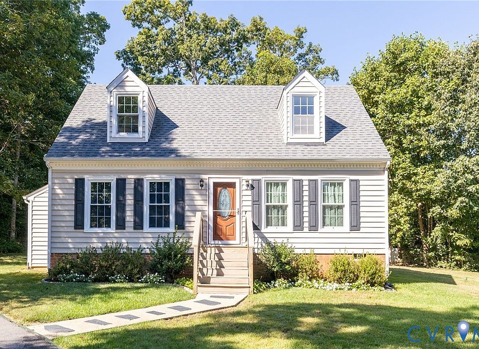 Welcome home to this Charming 4-Bedroom Cape Style Home nestled in the serene Cabin Creek neighborhood in the heart of Chesterfield. Upon entry, you are greeted by the nice, bright, and spacious living room with new carpeting flooring and ceiling fan. The eat in kitchen offers LVP flooring, stainless steel appliances, corian counter tops, new cabinets and a dining area that offers plenty of light and a ceiling fan. Bedrooms one and two are located on the first level and offer brand new carpeting and large closets. There is also a spacious full bath on the first level with tile flooring and tile surround tub/shower combo. Ascend to the second level to find bedrooms 3 and 4. Both bedrooms offer new carpeting, ceiling fans, and large closets. They share the second full bath with walk in shower, tile flooring, and new vanity. Other notable features include Newer (2020) HVAC heat pump/central air, Newer Roof (2023), New double width paved drive, attached storage space, 4 irrigation rain collectors, and Brand New Rear Deck that is perfect for your morning coffee or entertaining your friends and family. A powered outbuilding presents a myriad of possibilities – from a creative workshop to additional storage space. Conveniently located near an array of restaurants and shopping. This home is also less than a 10-minute drive to Rockwood Park which offers a 5.5-mile walking trail and about 18 minutes from the scenic trails, fishing and kayaking at beautiful Swift Creek Lake in Pocahontas State Park. This One Will Not Last - Call and Schedule Your Showing Today!