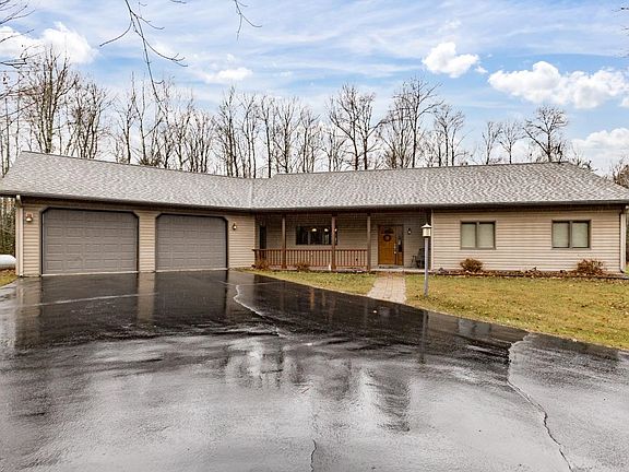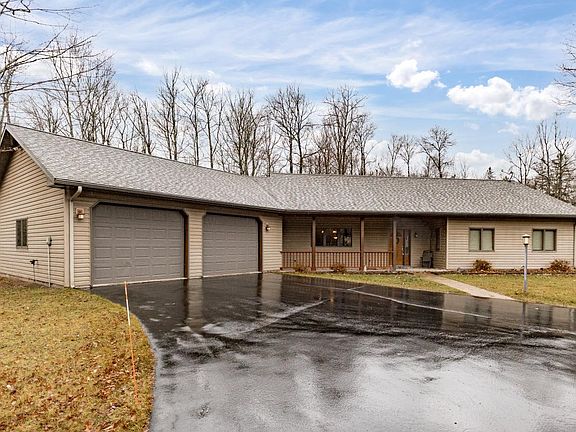 Welcome to your private oasis near Lyman Lake! This stunning custom-built 3-bedroom slab home sits on a wooded 2.5-acre lot, offering the perfect blend of comfort, functionality, and seclusion. The home features an open-concept layout with a floor-to-ceiling stone gas fireplace, tongue-and-groove vaulted ceilings, and four zones of in-floor heat for year-round comfort. The spacious kitchen includes a center island, stainless steel appliances, and flows seamlessly into a bright four-season room. Step outside to discover the dream detached heated garage/workshop—complete with 9' walls, an electric sauna, finished bedroom, attic storage, and plumbing for air tools. It's fully sheet rocked and ready for any project or hobby. Additional highlights include Anderson windows, a new roof, 200-amp electrical service, mosquito netting on the porch, RV parking pad, and a long blacktop driveway lined with lights. The property also includes an attached garage for added convenience. Tucked away from neighbors yet easily accessible, this home is located on ATV trails and near public hunting land—ideal for outdoor enthusiasts. Schedule your private tour today and experience all this unique property has to offer before it's gone!