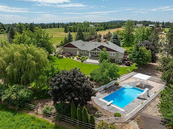 This beautiful Estate is situated on 5.1 private acres just minutes to the Airport, DT, Restaurants, Shopping, Parks & Trails. The custom lush landscape is phenomenal, who needs a vacation when you can escape to your own back yard paradise equipped w/ multiple decks, covered & open patios, 9 foot deep heated pool w/water slide, diving board, vinyl pavilion, gazebo, greenhouse & fenced garden area w/hen house & fruit trees. Walking inside you are greeted by new maple floors, open floor plan great for entertaining, gas fireplace flanked by custom built in's. Giant gourmet kitchen w/spans of gorgeous granite counters, loads of custom cabinets, roll out's, double ovens, enormous walk-through pantry too. Expanded primary suite with fireplace, private deck, jet tub, separate shower & walk-in closet. The daylight walk out lower level is perfect for multi-gen w/a wet bar, large rec room, "flex" room...did I mention the climate controlled 1200 bottle wine room? 20x 40 shop w/2-14' doors + 24x24 shop & 12x16 shed too!