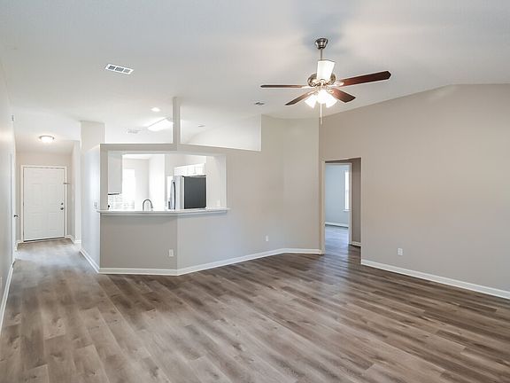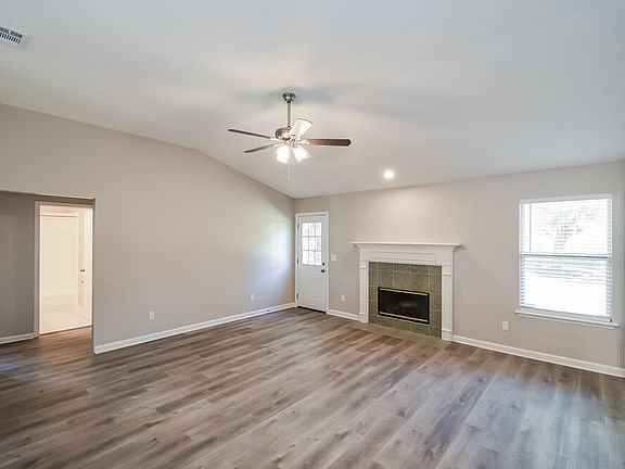 This single-story Jacksonville rental home comes with three bedrooms, and two bathrooms in 1,456 square feet. Laminate flooring runs through the house. The living room's fireplace adds a lot of character, and its high ceiling with a fan makes it feel airy and open. A modern chandelier hangs from the ceiling in the dining room, and a large window lets in natural light. In the kitchen, stainless-steel appliances make cooking fun, and white cabinets and matching quartz countertops provide plenty of storage and meal prep space. The main bedroom offers a ceiling fan, a walk-in closet, and an en suite bathroom with a garden tub, walk-in shower, and double vanity. Contact us today for a tour.