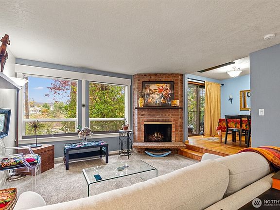 Tranquil wooded outlook. Spacious and comfortable 2-bedroom, 1.75-bath condo offering excellent value in a well-maintained, secure-access community. The inviting living room features a wood-burning fireplace and opens to a dining area with access to a covered balcony overlooking a peaceful, park-like setting. The kitchen and in-unit laundry room provide everyday convenience, while the primary bedroom includes a private bath. Additional highlights include an extra storage unit and two parking spaces—one covered. Private setting. Conveniently located near shopping, freeways, and transit. Minutes to Downtown Edmonds.